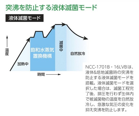 1701Bは、液体や培地滅菌時の突沸を防止する「液体滅菌モード」を搭載しています。