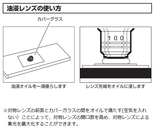 ※100倍対物レンズには油浸オイルが必要です。