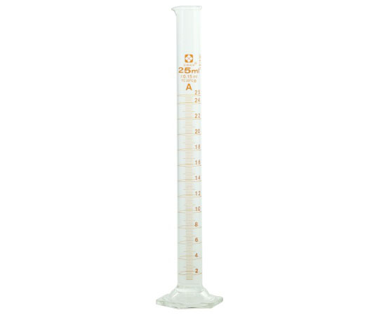 ●液体の体積を測定するための目盛の付いた細長い円筒容器です。●注ぎ口があり、液体を測りとるのに用いられます。●目盛は受入体積(入っている体積)を表し、受用(入用)を意味するTCを表示しています。(TC:To Contain の略)目盛は20°Cの水を測定したときの体積を表します。●JIS規格(R3505)クラスAの「体積の許容誤差」より高精度です。