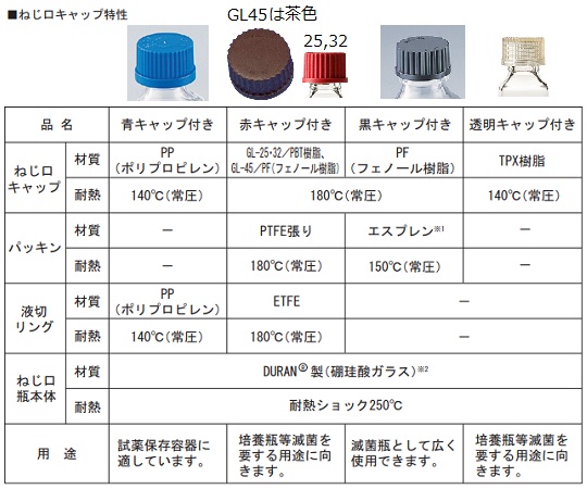 ●バイオテクノロジー関連をはじめ、高純度医薬試薬や分析用標準液などの保存容器として幅広くご使用いただける多目的びんです。●ガラス材質は、JIS R3503(1994年)「ほうけい酸ガラス-1」に相当するDURAN®を使用しています。●DURAN®はドイツDWK Life Sciencesグループの登録商標です。●キャップは全品ISOねじ(GL)を使用しています。●ビン底には細かい凹凸をつけて接触面積を小さくしています。●均一な肉厚で機械的強度が増加しています。