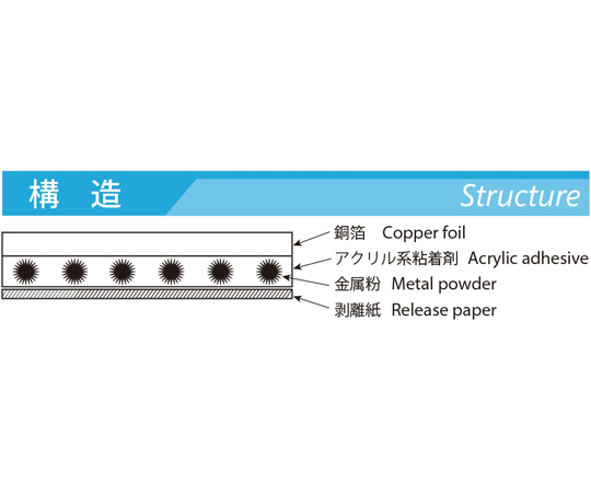 ●幅:19.0mm●長さ:50m●金属箔厚み:18μm●粘着剤厚み:35μm●合計製品厚み:53μm●接着力:10N以上/25mm(180°ピール対SUS)●接触抵抗値:0.002Ω/25mm□19.6N)●難燃性:UL510FR