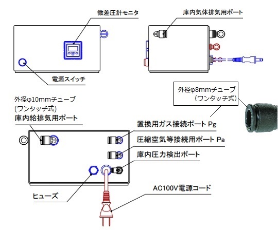 ●外部のガス供給源と接続することで外気圧(庫外)とグローブボックス内の圧力差を設定された微差圧内(-0.5kPa~-0.01kPaもしくは0.01kPa~0.5kPa)で自動的に維持しデジタルで表示します。
