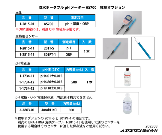付属品:専用pH電極201T-S×1本、 pH標準液(NIST規格 pH4.01・pH6.86・pH9.18×各1本)