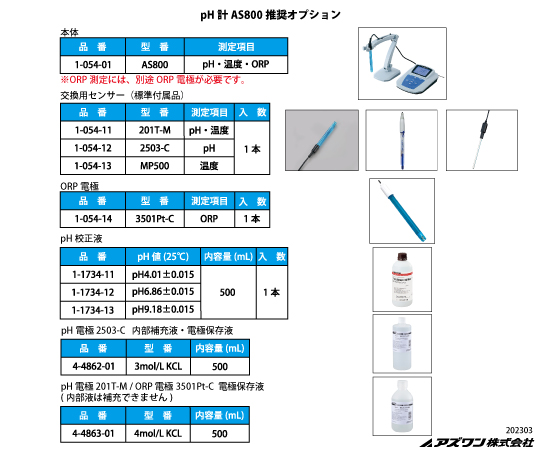 付属品:pH/温度センサー201T-M(pH/0~14、温度/0~80°C)×1本・高精度pHセンサー2503-C(pH/0~14)×1本、温度センサーMP500(温度/-10~+110°C)×1本・pH標準液(pH4.01・6.86・9.18)×各1本・電極スタンド×1台・RS232Cケーブル×1本・通信ソフト×1枚