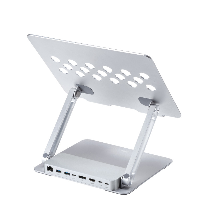 USB Type-Cケーブル1本でディスプレイ最大2台( HDMI/DisplayPort)、各種USBデバイス、有線LAN、USBオーディオの拡張接続ができるノートパソコンスタンドが一体になったUSB Type-Cドッキングステーションです。