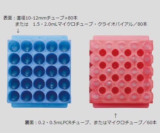 収納数(両面使用時):スクリューキャップチューブ(0.5~2.0ml)、 クライオバイアル(1.0~5.0ml)/25本、 PCRチューブ、 遠沈管(0.2~0.5ml)/16本