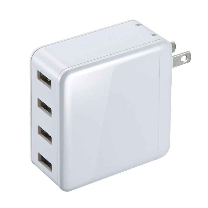 USBポートを4ポート搭載しスマートフォン、タブレットなどの機器を4台同時に充電できるUSB充電器です。