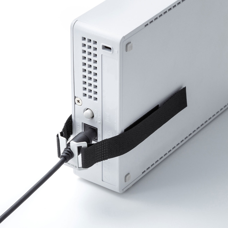 I/Oロック(R)ベルトは、プラグを押さえるマジックフッカー付き面ファスナー凹面と機器側に取り付ける粘着付き面ファスナーの凸面の組み合わせで構成されています。