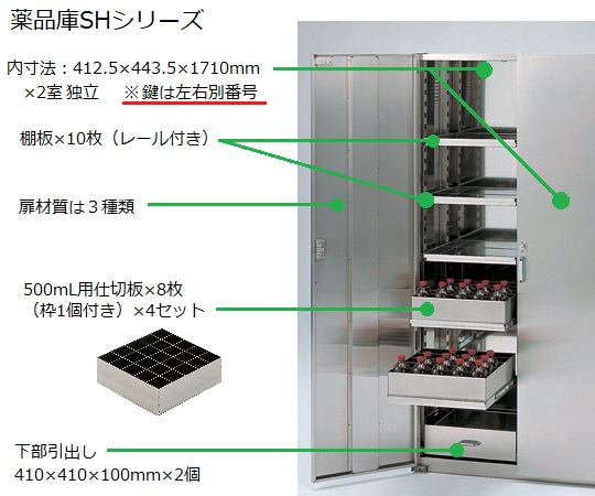 付属品:棚板×10枚(レール付き)、引出し×2個、500mL用仕切板×8枚(枠1個付き)×4セット