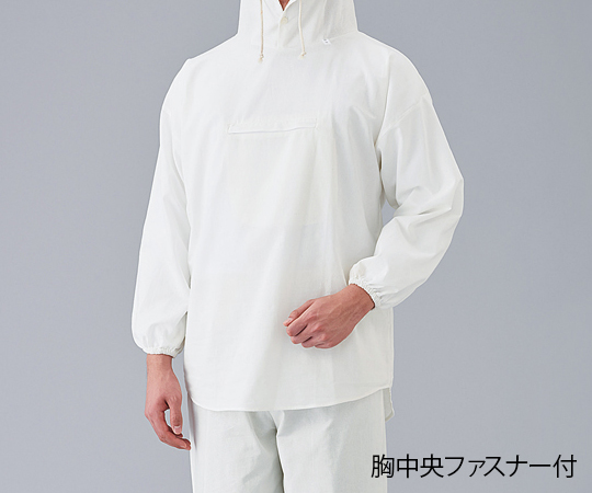 フード締め紐、袖・裾ゴム、右腰後ろポケット、胸ポケット付き(胸ファスナーポケット)