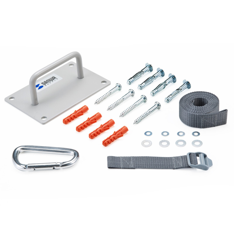 壁面にベルトを引っ掛けるためのブラケットとベルトのセットです。取り付け用ボルトは壁面の材質に合わせて選択できます。(仕様のセット内容をご確認ください。)