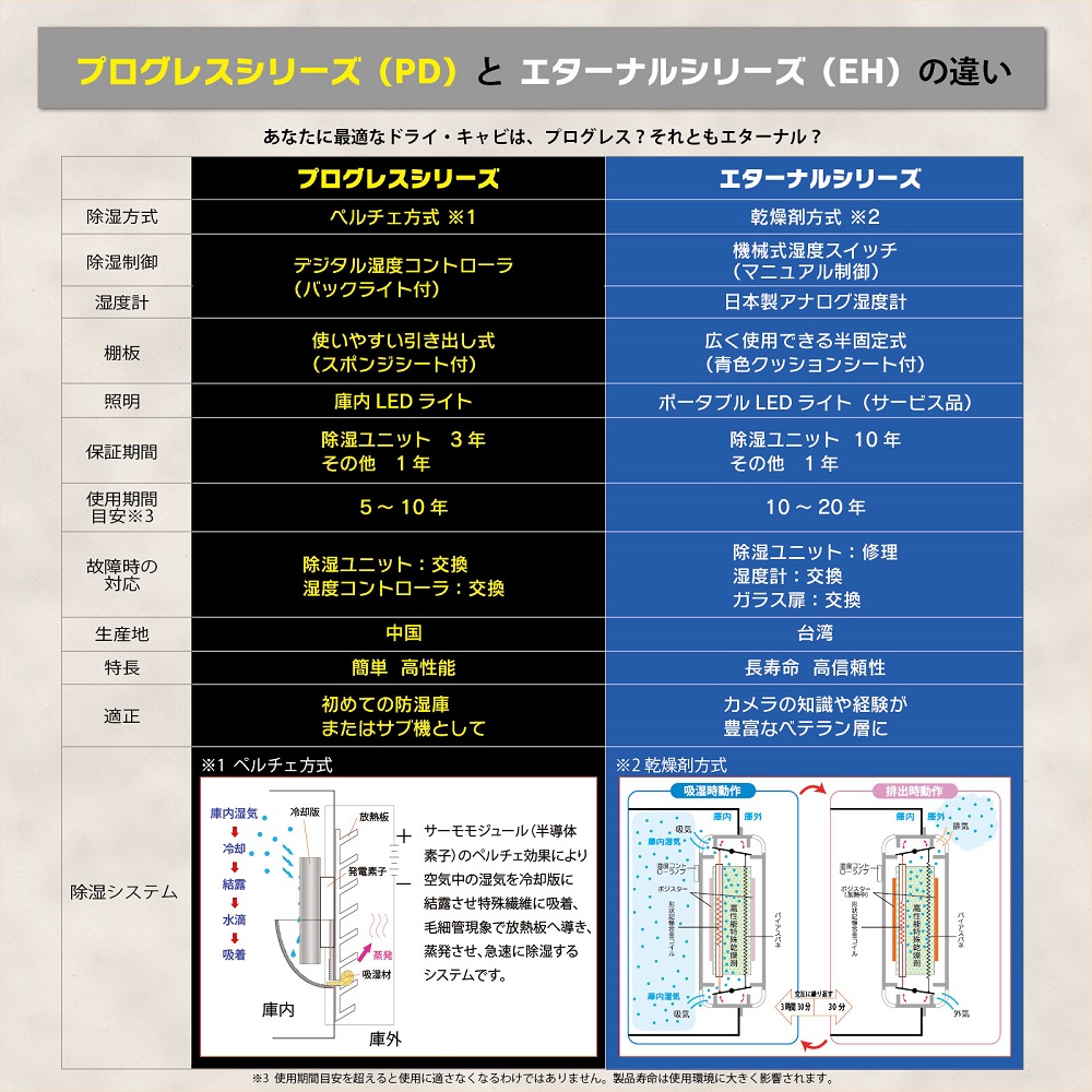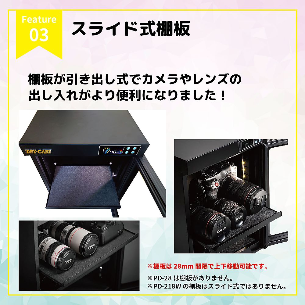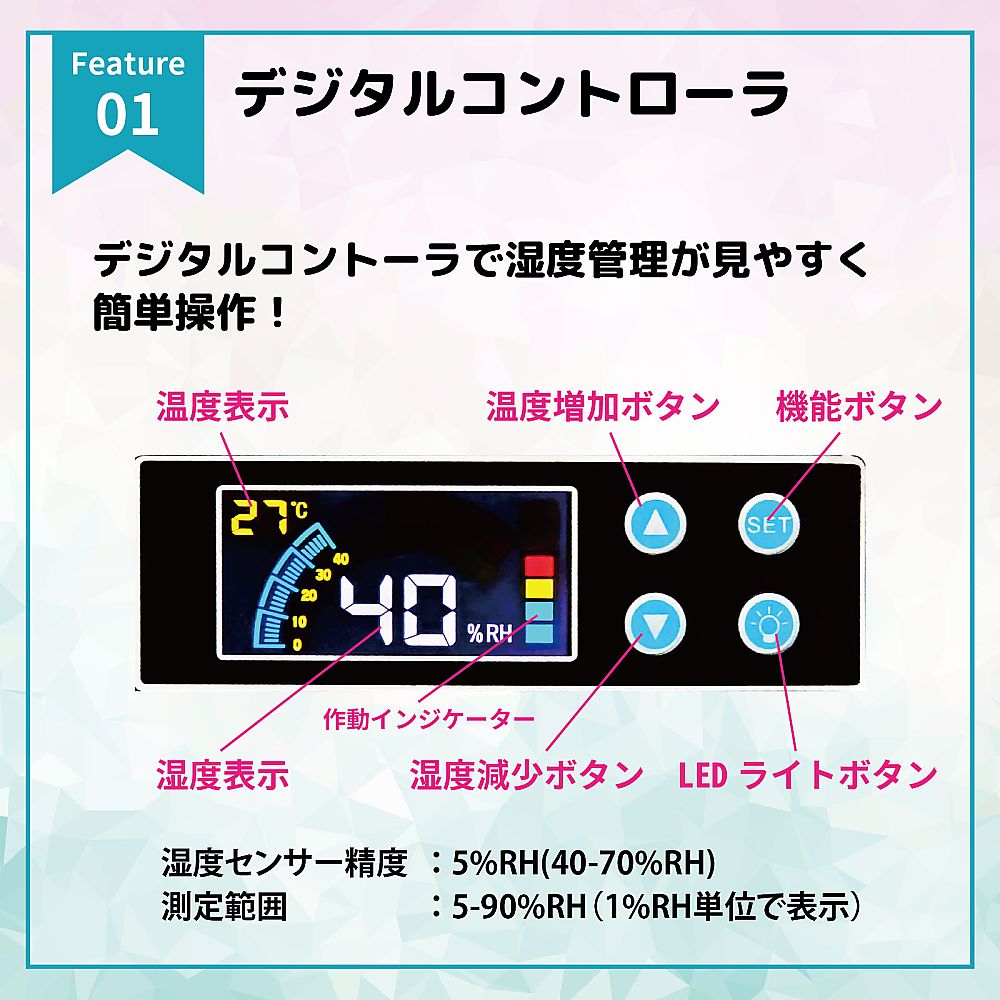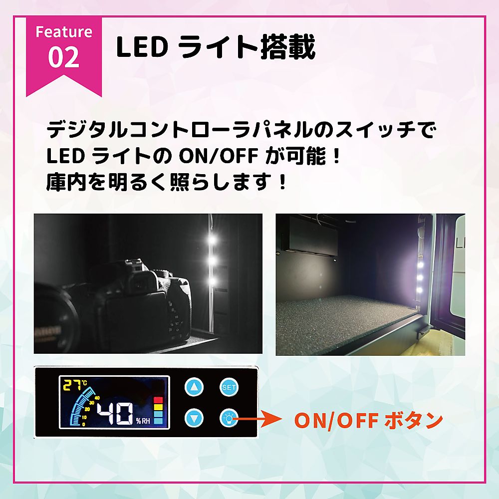 ●マイコン制御による超エコ設計の高性能ペルチェ式除湿ユニットを搭載●湿度設定機能付きデジタル湿度計を採用(電池不要)●庫内にLEDライトを搭載(コントローラーパネルでON/OFF)●使いやすい全面ワイドドアーは密閉性に優れたマグネットパッキン式(キーロック付き)●引き出し可能なスポンジシート付き棚板を標準装備●無音、無振動