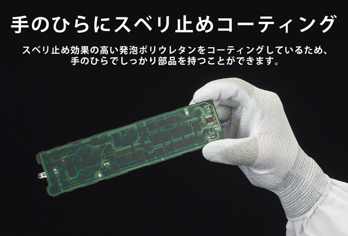 ●静電気対策用手袋●導電糸は『硫化銅複合繊維』を採用しているため、作業中の摩擦、接触による耐電を防ぎます。●より導電性を求められる指先部分は導電糸のみで編んでいます。●長繊維を採用しているため、手袋からの発塵を抑えます。●制電ラインフィットA0150掌部に「スベリ止めポリウレタンコート」●手の平の強度を向上させました。●通気性にも優れています。