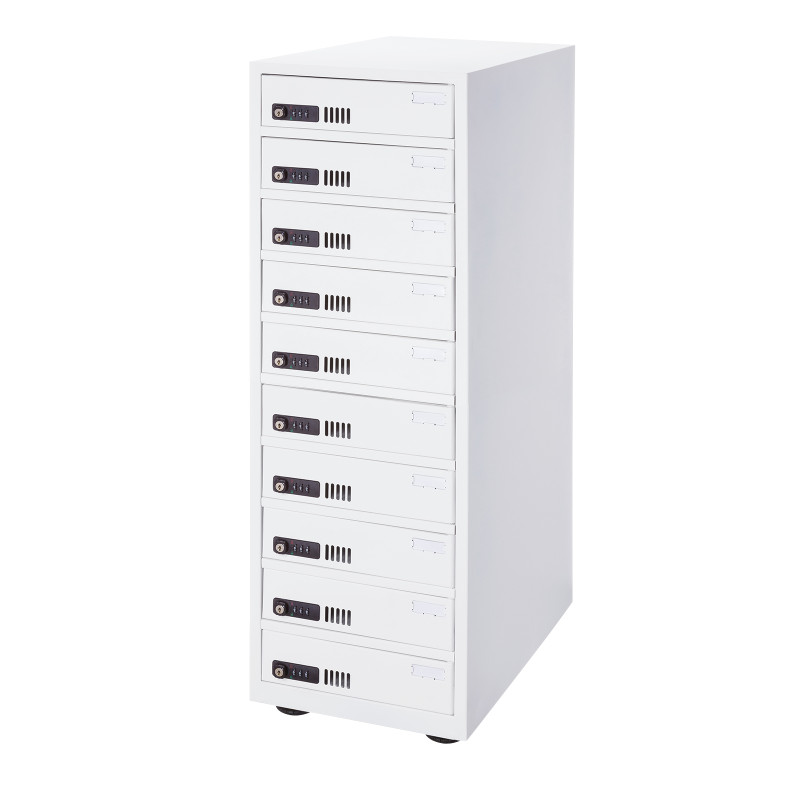 10台のタブレット、Chromebookなど14インチ程度までの機器を個別に管理できる保管庫です。