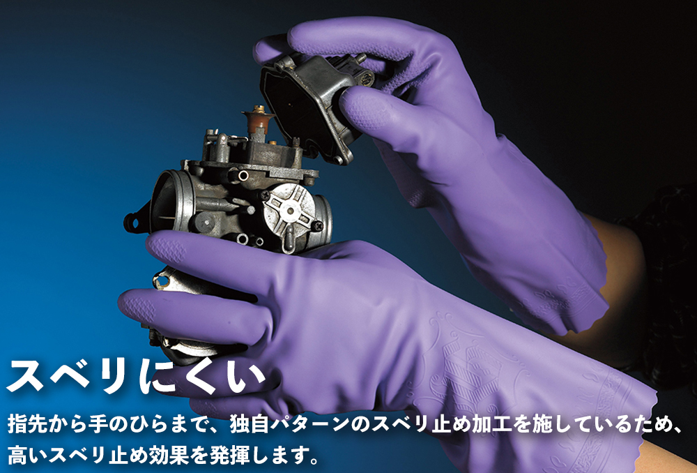 ●洗剤、油に強い。●耐久性があり、丈夫な厚手タイプ。●指先を強化 :傷つきやすい指先はダブルコート(2度付加工)により、強度を向上しています。●スベリにくい :指先から手のひらまで、独自パターンのスベリ止め加工を施しているため、高いスベリ止め効果を発揮します。●裏毛付きでぬぎはめしやすい。 ●裏毛には抗菌防臭加工を施しているため、繊維上の細菌の増殖を抑制し、汗などによる臭いの発生を抑えます。
