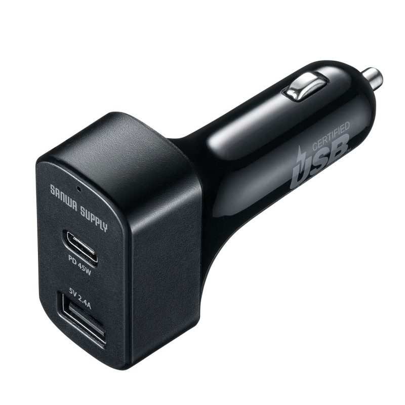 USB Power Delivery規格に対応し、USB-IFの認証を取得したカーチャージャー。スマホ、タブレットを急速充電でき、最大45Wの出力でノートPCの充電もできる車載充電器。