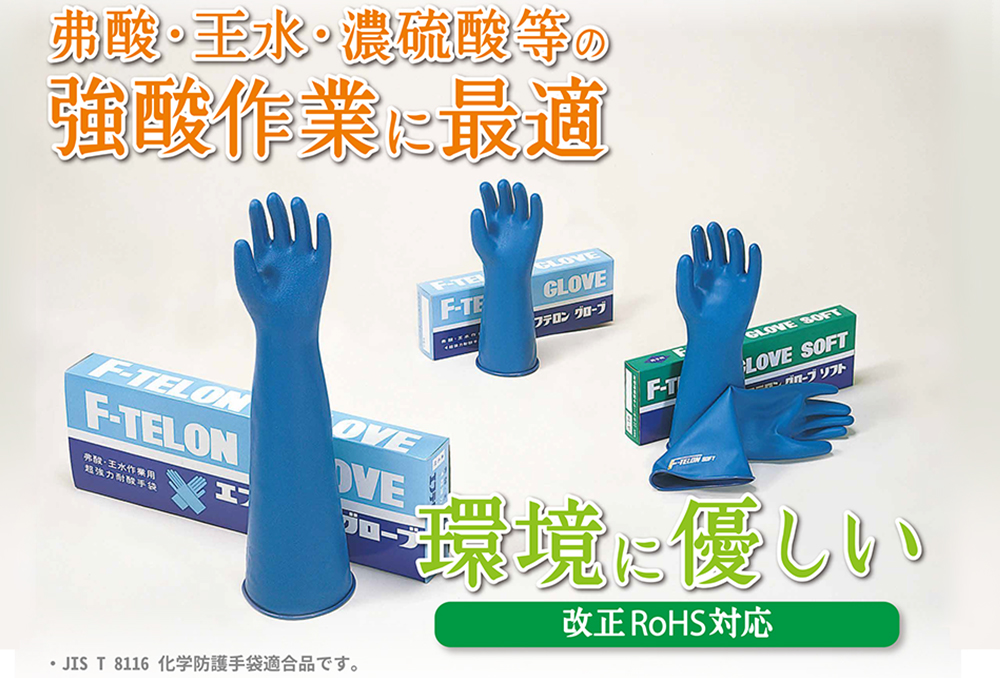 ●フッ酸、玉水、濃硫酸などの強酸作業用に最適。また環境にも優しい手袋です。(改正RoHS対応、鉛含有なし)