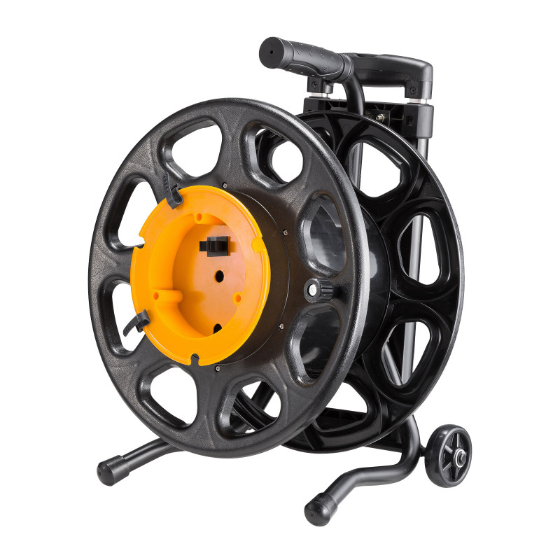 LANケーブル、同軸ケーブルを巻き取り、移動に便利なキャスター・伸縮ハンドル付きのケーブルリール