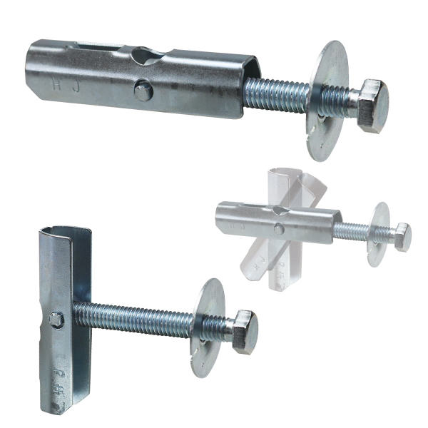 下穴から水平に差し込んで、壁裏側の本体が垂直に立ち、壁面と取付物をしっかり固定することができる。