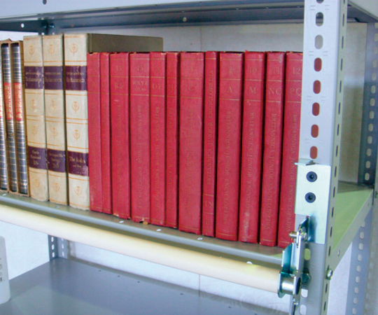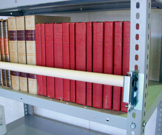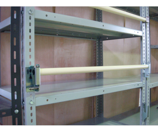 棚の両端に設置したパイプホルダーとパイプバーにより、棚板上に載せてある保管品の落下を防ぎます。