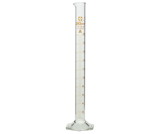 ●液体の体積を測定するための目盛の付いた細長い円筒容器です。●注ぎ口があり、液体を測りとるのに用いられます。●目盛は受入体積(入っている体積)を表し、受用(入用)を意味するTCを表示しています。(TC:To Contain の略)目盛は20°Cの水を測定したときの体積を表します。●JIS規格(R3505)クラスAの「体積の許容誤差」より高精度です。