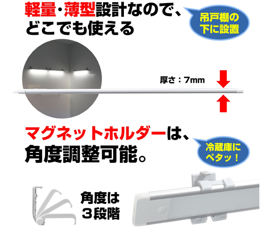 ●非接触スイッチに手をサッとかざすだけで電源をON/OFF、手をかざし続けると最大(100%)~最小(約10%)の間で無段階調光できる。●別売の連結子機(31cm)を3台まで連結可能。 ※61cmの連結子機は使用できません。●付属マグネットホルダーで角度調整可能●導光板使用でスリムなのにムラなくしっかり明るい●薄型スリムなので簡単に取り付け可能