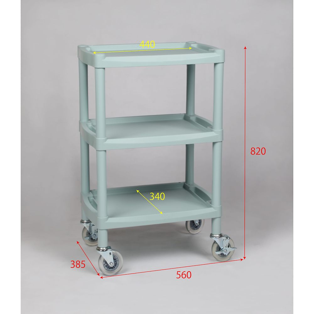 ●サイズ(mm):560×385×820●重量(kg):6.8●材質:天板/PP、支柱/ABS樹脂、キャスター/ウレタン●耐荷重:15kg/枚●キャスター:Φ100mm(ストッパー付き×2個・ストッパー無し×2個)※静音キャスターは、プラスチックワゴン(1-8544-11~14)にも使用可能です。●棚数:3段(棚板間隔:250mm)