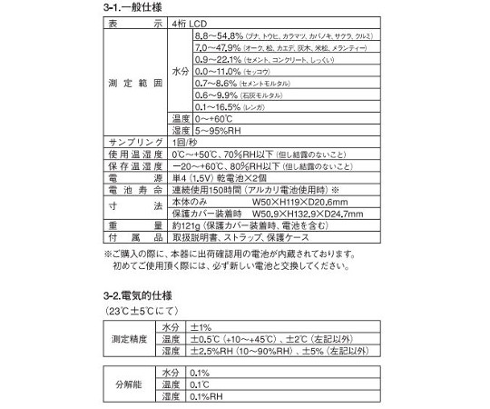 測定精度:M-290/±1%、M-291/±1%(水分率)、±0.5°C(温度・10~+45°C)、±2.5%RH(湿度・