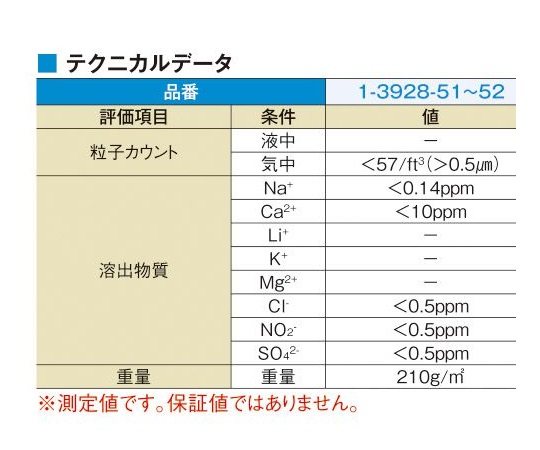 抽出イオン:Na、0.14ppm以下(μg/g)、Ca、10ppm以下(μg/g)、CL、0.5ppm以下(μg/g)、NH4、1ppm以下(μg/g)、NO2、<0.5ppm以下(μg/g)、SO4、0.5ppm以下(μg/g)