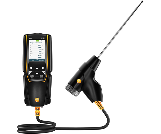 ●testo 310 II はエントリーモデルの燃焼排ガス分析計。●プローブ一体型のコンパクト設計で持ち運びがしやすい。●約30秒でゼロ調整が完了するので、現場での業務を効率的に実施。●最大7項目表示可能な高精細カラーディスプレイを採用。●本体は堅牢ボディで過酷な環境での使用に求められる頑丈設計。●モバイルアプリ testo Smart 連携でtesto 310 II 本体の設定や測定結果の表示が可能。●testo Smartは測定データの記録し、テキストファイルのエクスポート、測定レポート作成や送信などの文書管理にも対応。●testo Smartは測定値をアプリ上で遠隔表示できるので、バーナーコントローラの近くで測定値を見ながら調整作業が可能。●差圧、ドラフト圧、燃焼効率、排ガス損失、CO2演算も測定可能。